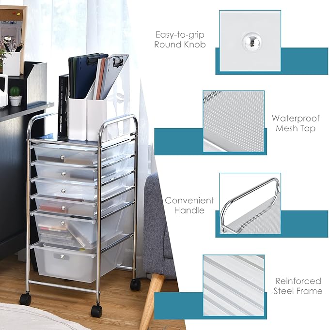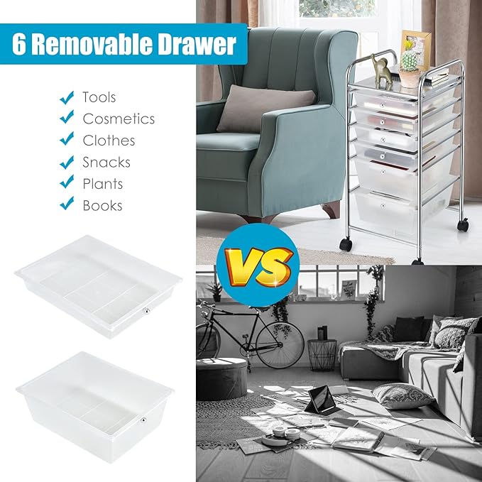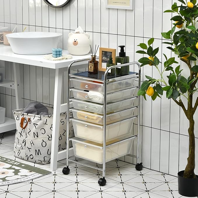 - 🌼【Sturdy Steel Frame & Durable Plastic】 The storage cart is made of chrome-plated iron, making the cart rust-resistant and corrosion-resistant for long-lasting use. And 6 drawers are made of high-quality plastic, ensuring great load capacity and durability.