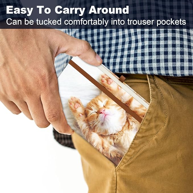 - Pocket Hardcover Notebook: The cute A6 mini notebooks measures 3.9x5.7inch. Fits in back pocket, shirt pocket or purse well. Includes 160 pages ivory thick paper, 1 ribbon bookmark, 1 inner pocket, 1 Pen Holder loop and 1 elastic closure band