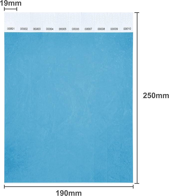 - Blue wristbands are10" long and 3/4" wide. A piece of paper is 10 wrist straps. 100 wristbands have 1-100 consecutive numbers.