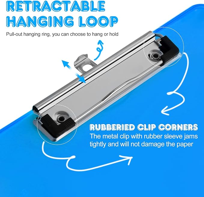 - RETRACTABLE HANGING LOOP: The clipboards have a built-in hanging hole, which can help you place your documents randomly. And it can be stowed away when not needed