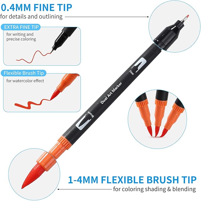 - Dual Tip Pens :Upanic brush tip markers are 1-4 mm brush tip with 0.4mm fine tip, and fine ,medium or bold strokes by tilting the brush pens .The brush markers allow you easily laying down thick,thin,or varied lines in one stroke and are great for coloring,drawing,writing and lettering etc.