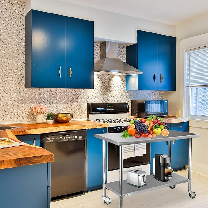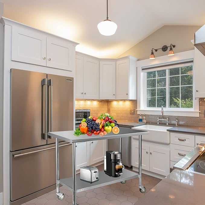- Adjustable Work Table: Adjustable undershelf and table feet make this stainless steel table applicable to various scenarios, you can freely change the height of the undershelf to suit your demands. By casters, you can move it easily