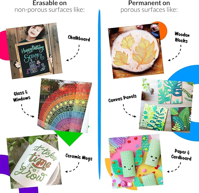 - Comes Off Easy - Our erasable chalk markers for chalkboard will work on almost any surface! These neon chalk markers will erase off non-porous surfaces such as glass & mirrors (dry & wet erase markers) & permanent on porous surfaces (wood).