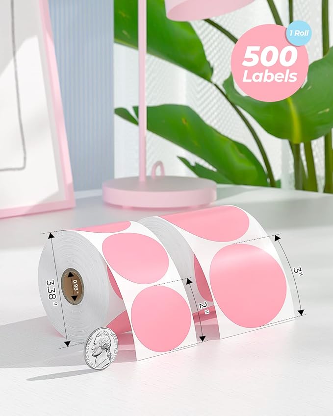 MUNBYN 3 Inch Pink Circle Thermal Sticker Labels, Multi-Purpose Self-Adhesive Round Direct Thermal Labels for Business, 500 Sheets/1 Roll