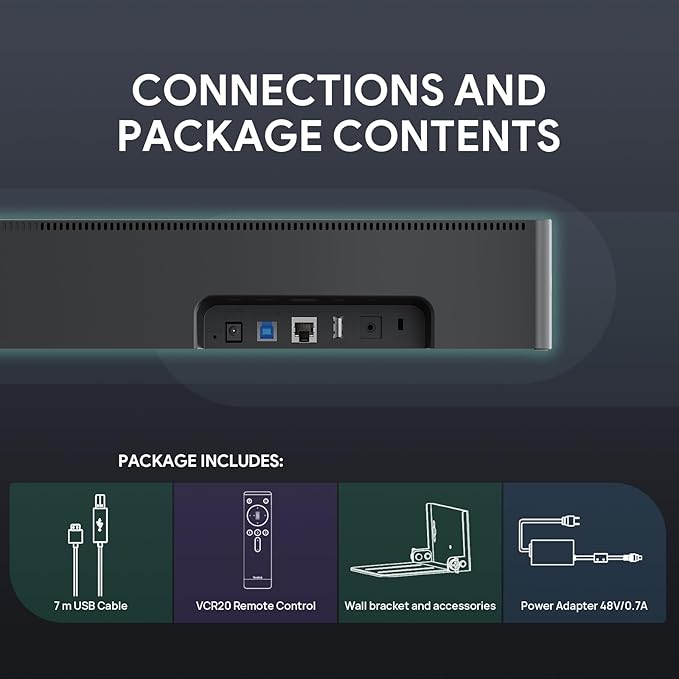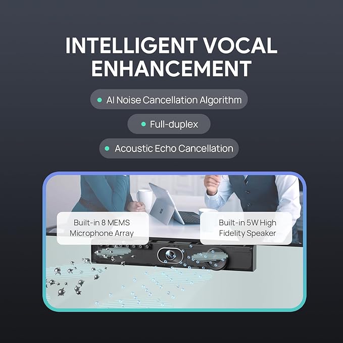 - Better Audio Experience: This video camera built-in 8 Full-duplex & Noise Cancelling microphones array suppress background sound so everyone in the conversation can be heard clearly. And it has a 5W speaker for high-fidelity audio. All in one designed to bring a better audio experience for small and huddle conference rooms.