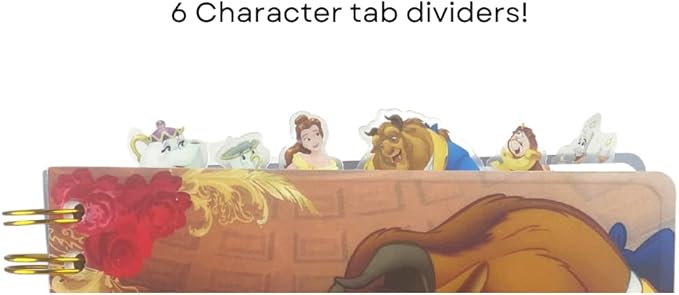 - BEAUTY AND THE BEAST NOTEBOOK - Features lined pages with colored rose illustrations on the corners, 6 color illustrated section dividers, and tab dividers.