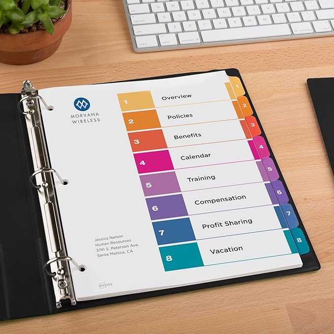 - 8 Tab Dividers feature a customizable table of contents page with easy-to-use Ready Index template, double-sided reinforced holes and tabs and coordinated multicolor tabs for organizing subjects