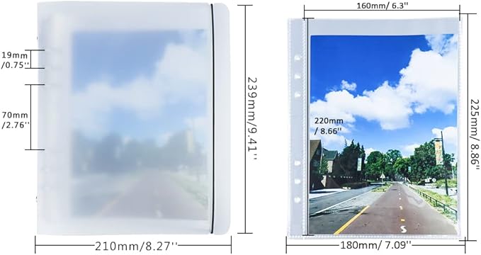 - 4.MEASUREMENT--180mm x 225mm(7.09" x 8.86") photo album pages and 210mm x 239mm(8.27" x 9.41") 6 ring photo sleeve binder. The 160mm x 180mm(6.3" x 8.66") Pockets perfect for 8inch or small photos and cards, 1 pockets per page. You can easily insert photos and cards in the photo sleeves.