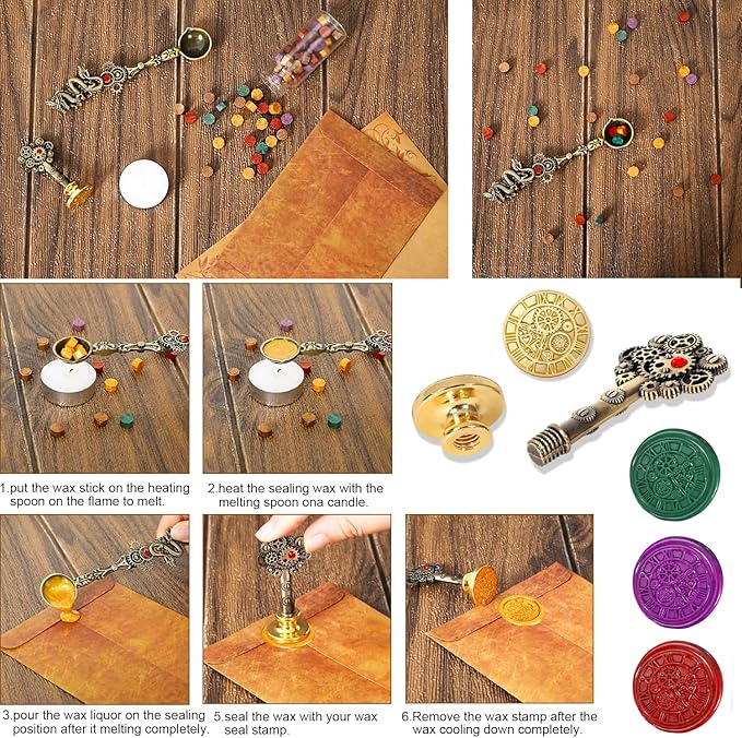 - 【Wax Seal Stamp Kit】: Our wax stamp is made of high quality brass head and metal gear shank, the stamp is printed with a "gear clock" pattern. It creates intricate details and leaves a clean and beautiful imprint. The brass head with stamp is removable and can be used with any stamp pattern. It avoids opening important documents while decorating, embellishing, invitations, envelopes, postcards, gift stamps and other private information.