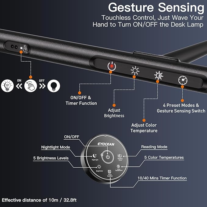 - 【Gesture Sensing & Adjustable Color Temperature】 Wave your hand to turn the desk lamp ON / OFF without touching it. You can also manually adjust the brightness and color temperature as needed using the touch controls. Warm light makes people relaxed and comfortable, and cool light makes people more focused and productive. The memory function remembers your last settings and requires no reset