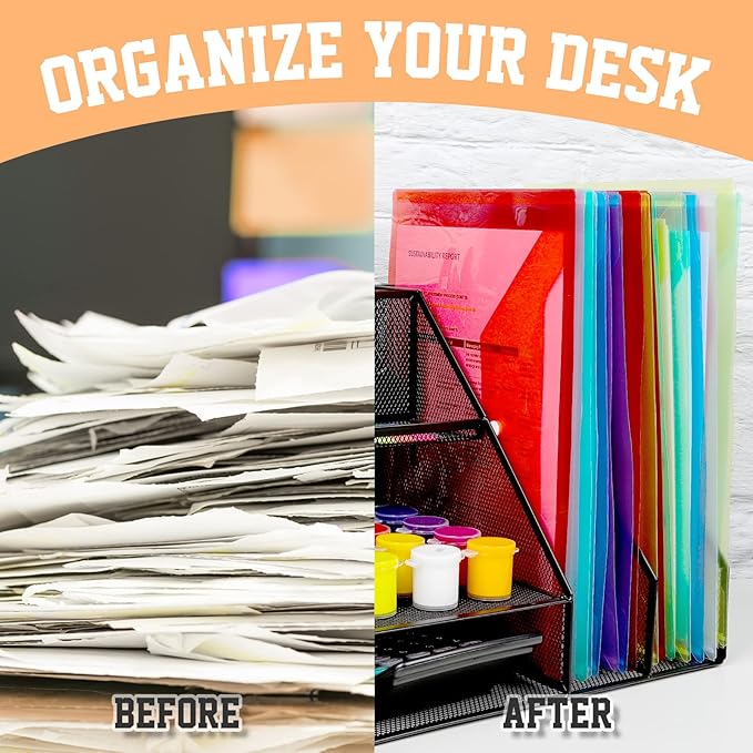 - Multipurpose Plastic Folders: 24pcs File bags for school use, to hold papers, handouts, notes, stationery etc., for office use, to keep brief report, project document, finance statement, meeting material etc., for home use, to store bills, receipts, appliance instructions, photos etc., for craft items, craft papers, stickers, embellishments, for storing travelling items, makeup items and so on.