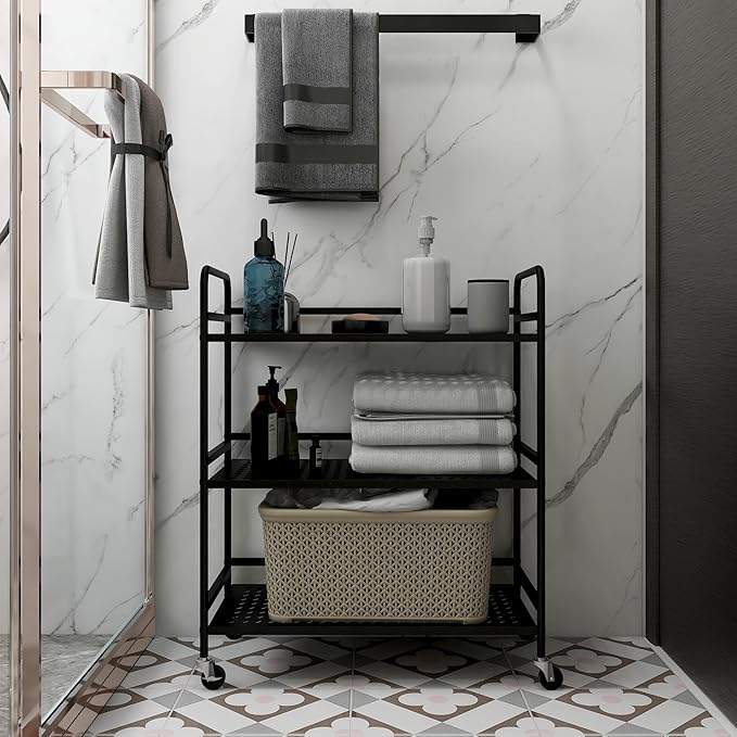 GYCZYCX 3-Tier Mesh Metal Rolling Cart,Multipurpose Heavy Duty Cart,Multipurpose Storage Rack,Utility Cart,High Capacity Cart with Locking Wheels (Black)