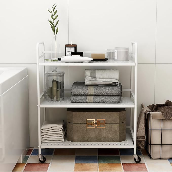 3-Tier Mesh Metal Rolling Cart, Multipurpose Heavy Duty Cart, Multipurpose Storage Rack,Utility Cart, High Capacity Cart with Locking Wheels(White)