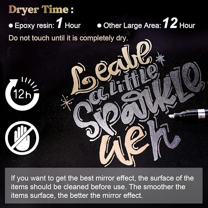 - Wide Application: Mirror chrome markers can show high-gloss metal reflective effects on a variety of materials. It is very suitable for use with LET'S RESIN epoxy resin and resin molds for resin coloring, coaster strokes, domino coloring, writing, painting, etc. If you want a better preservation effect, you can cover it with resin after completion. It can also be used on models, stones, wheel rims, metal, glass, ceramics, plastics, car parts, shoes, and other smooth and non-absorbent surfaces.