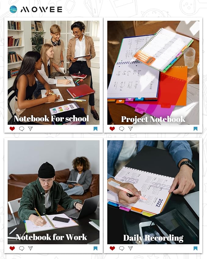 - NOTEBOOK WITH POCKET DIVIDERS: 5 movable pocket dividers perfectly hold 11" x 8-1/2" papers. Multi-colored dividers and practical index tabs suitable for pages classifying, quick reach for the specific part. 10 extra tabs for replacement