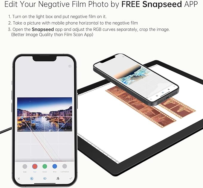 - Ideal Photographic Light Source: Color temperature: 5600K±200k, simulates natural white light to give negatives and slides a natural tone when viewing or photographing. Color Render Index>95Ra(measured data 98.6Ra), the high CRI helps restore true color of the original image. A perfect light tool for viewing and digitalizing negatives and slides with your phone and camera