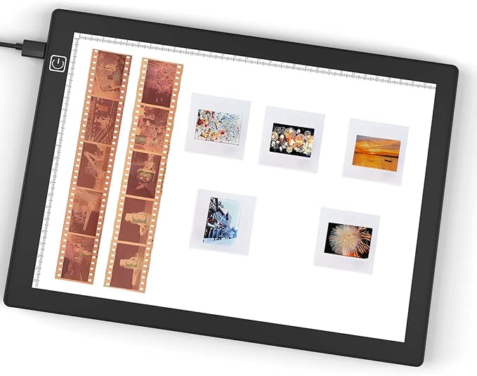 - Ultra-Thin with Large Active Area: This light pad is ONLY 0.26 inch thick. Active area 12”x8.3”, the large area makes it more efficiently for you to convert negatives, films and slides into images with phone/camera (up to 20 slides at one time).