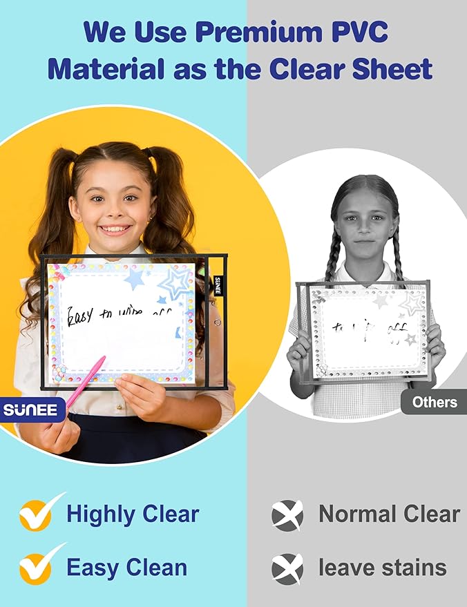 - Oversized for Easy Inserting Paper: Our oversized write and wipe pockets make kids can easily change the letter size (8.5x11) or 9x12 worksheets by themselves