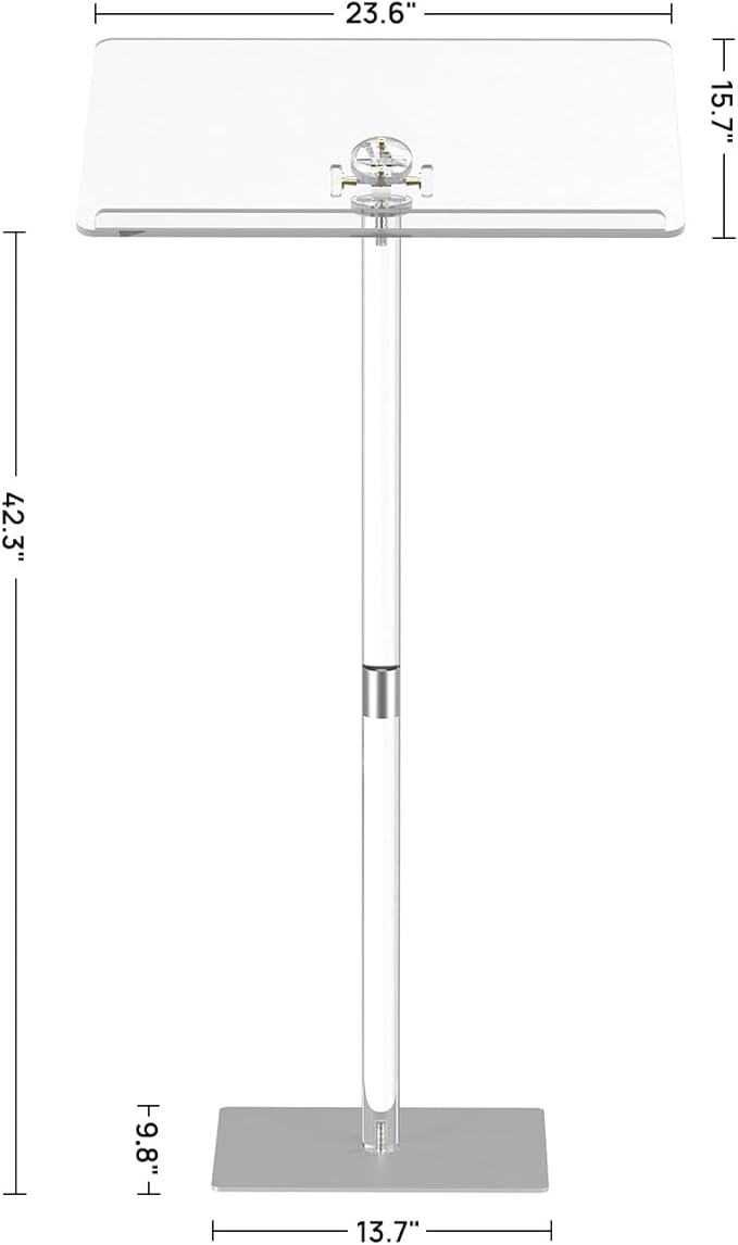 HMYHUM Acrylic Podium Stand, Angle Adjustable, Modern Lecterns & Pulpits for Classroom, Concert, Church, Speech, Easy Assembly, Metal Base, 23.6" L x 15.7" W x 42.3" H, Clear