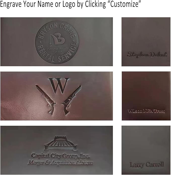 - Personalized Leather Portfolio: You can customize your name, which defaults to the lower right corner, or logo, which defaults to the top middle. Simply choose your customization option and input the name or logo. If you have additional customization requirements, such as left-handed people, please feel free to contact us via email after placing an order. We will do our best to assist you. Please note that the image logo is usually debossed and cannot be customized in color.