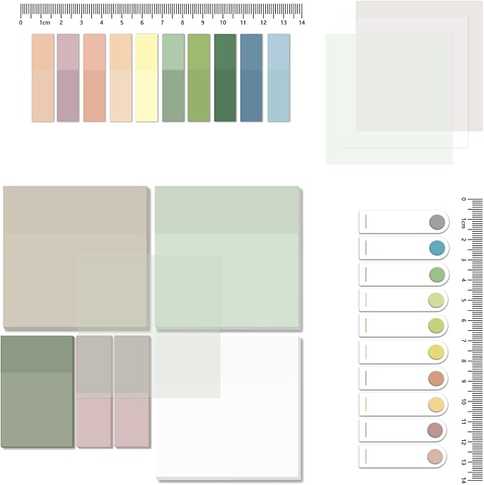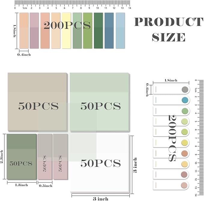 - What Will You Get: 150 Sheets transparent sticky notes( 3x3 inch ), 50 Sheets green translucent sticky notes(2.3x1.45 inch), 100 Sheets pink translucent sticky notes(2.3x0.7 inch), 400 Sheets morandi pastel different colors book tabs(1.8x0.4 inch)