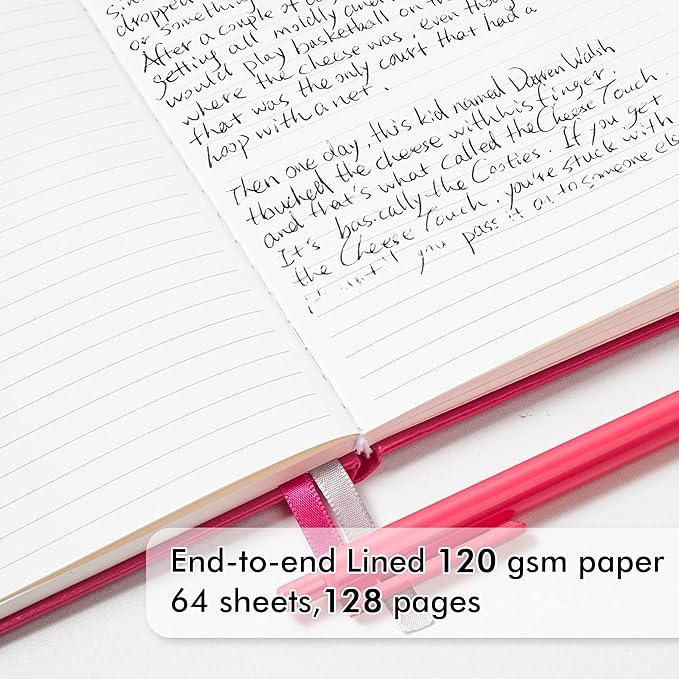 - These classic ruled notebooks are all blank inside with 128 lined pages (64 sheets), which would be convenient for daily usage. The hard cover journal has a water-resistant faux leather cover, round corners and bookmarks, which is designed to lay and open flat. There’s a “date/page” column on the top of every page. You can use it as a reminder to let you remember those important dates and find the page you want in a very short time.
