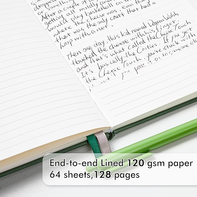 - These classic ruled notebooks are all blank inside with 128 lined pages (64 sheets), which would be convenient for daily usage. The hard cover journal has a water-resistant faux leather cover, round corners and bookmarks, which is designed to lay and open flat. There’s a “date/page” column on the top of every page. You can use it as a reminder to let you remember those important dates and find the page you want in a very short time.