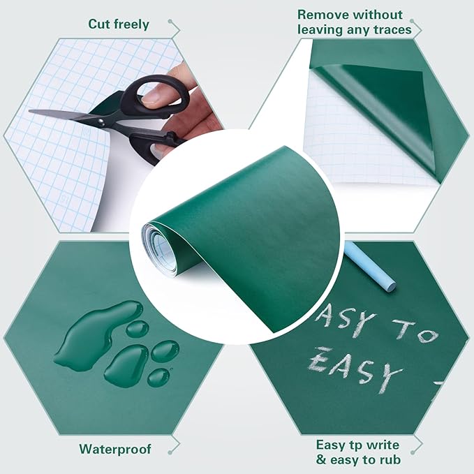Chalkboard Wallpaper Stick and Peel: Green Contact Paper Classroom Chalkboard Stickers Chalk Board Paint Self Adhesive Wall Paper with 8 Colorful Chalks (17.5 X 78.7 Inches)