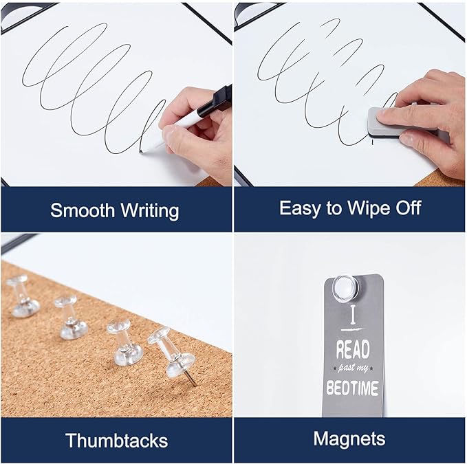 - PREMIUM QUALITY: This 16" X 12" small whiteboard set includes a dry erase board and corkboard. The magnetic whiteboard comes with a smooth surface, easy to clean up and write on. The bulletin cork board is equipped with premium durable cork, fits all variety of nails and pins without damage to the cork.