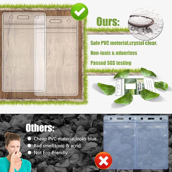 - 【Waterproof Dustproof & Soft Sturdy】Our horizontal and vertical badge holder card pouches are waterproof. can easily hold 3pcs credit card size cards. The name badge holder is made of premium PVC material, non-toxic, odorless. Both sides of each badge holder are transparent which makes scanning ID seasy
