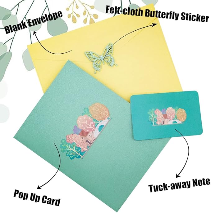 - [PACKAGING INCLUDED] 1 x 3D natural landscape card, 1 x tuck-away note card to write your warm wishes, 1 x high-grade butter-yellow envelope, 1 x felt-cloth butterfly sticker for sealing the envelope without spoiling its’ beauty.