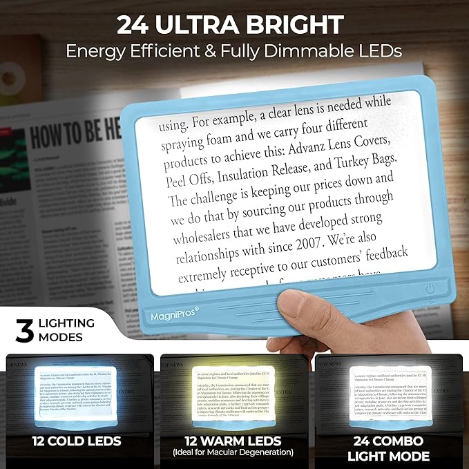 - ★ Eye Comfort with Anti-Glare Lens: Designed for seniors and those with low vision, our page magnifier offers enhanced reading through 24 SMD LED lights coupled with an anti-glare lens, ensuring optimal lighting without straining your eyes.