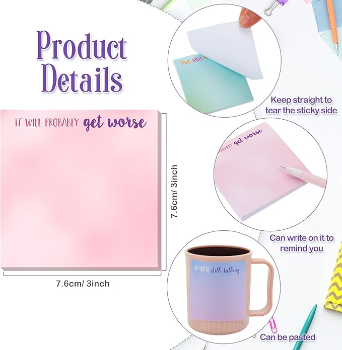 - Quality Material You Can Count: the funny sticky notes for the office are made of quality paper, reliable and strong, not easy to break, and the colors are not easy to fade; And the cute notepads for women are sticky, can be pasted on the wall, books, notebooks and other places