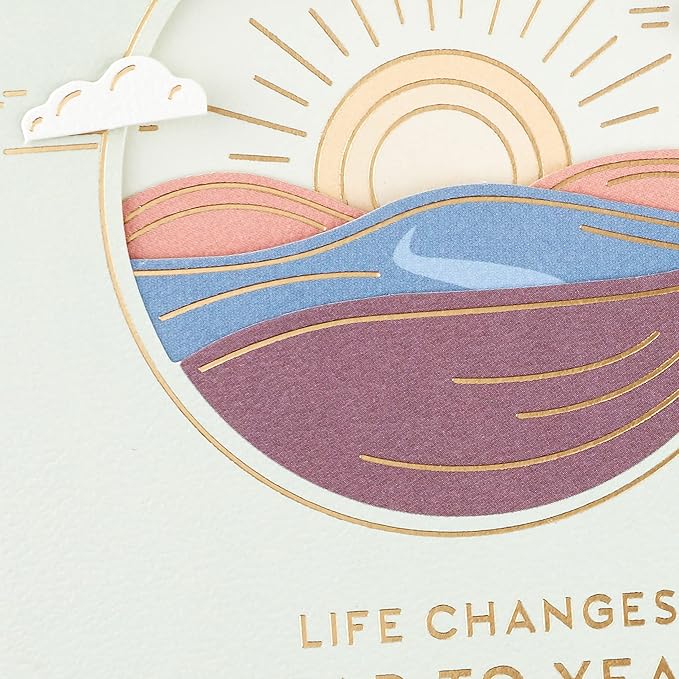 - Cover features a colorful design of the sun setting over the ocean, accented with gold foil. Message reads: "Life changes year to year. Love is for always."