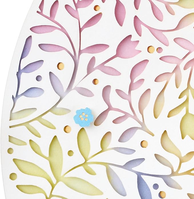 - Die-cut card in the shape of an Easter egg features detailed laser cut paper of leaves and flowers on a watercolor background.