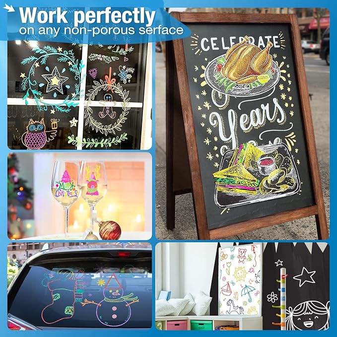 - 【Comes Off Easy】Chalk pens for chalkboard erasable are completely dust-free and they are car window markers for glass washable, wet erase markers, blackboard markers erasable pens for most non-porous surfaces with a damp cloth. Please recap the wet erasable chalk marker pen window marker after each using avoid the bistro chalk markers from drying out