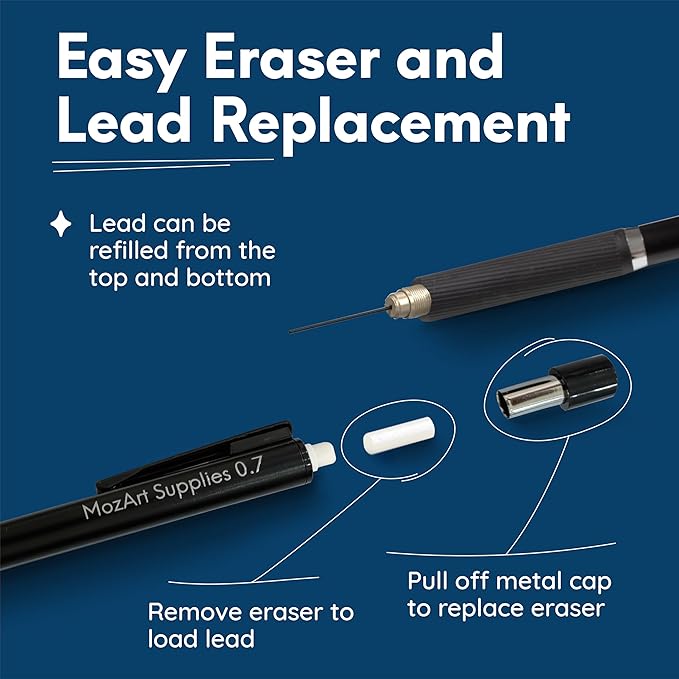 MozArt Mechanical Pencil 0.7mm Set with Case - With 2 x 30 HB Lead Refills, Eraser Pen With Refills -Sketch, Architecture, Drafting, Art, Drawing Supplies, Metal Mechanical Pencils