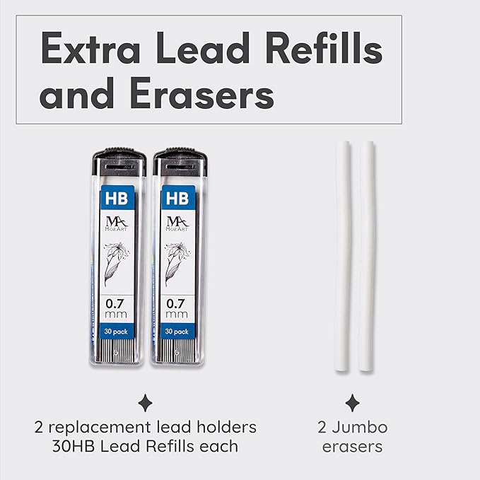 - Mechanical pencils set in 0.7mm, Set of 2 HB Tubes with 30x Lead Refills each with Eraser pen with 2 jumbo refills. These set is perfect for Writing, drawing, and sketching.