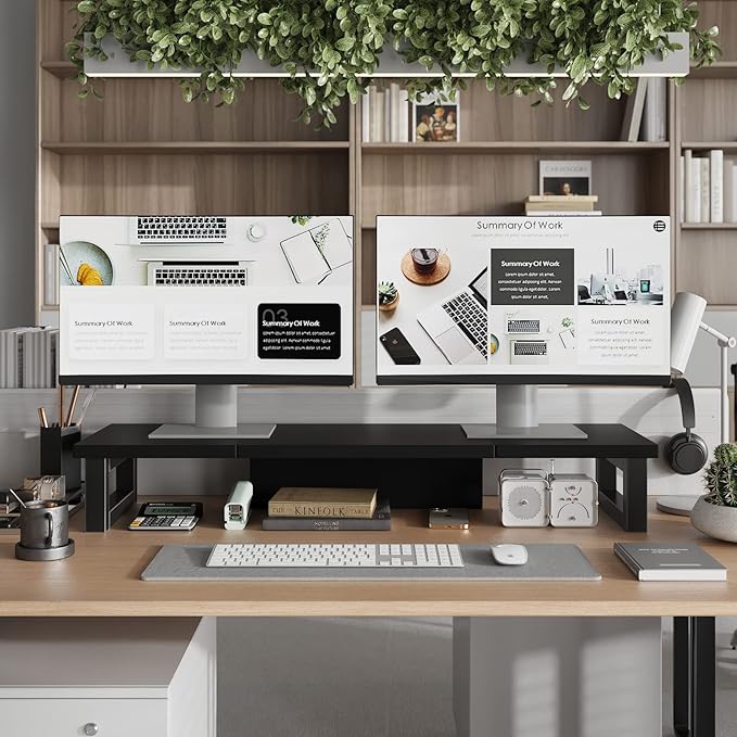 WESTREE Dual Monitor Stand Riser, Wood and Steel Monitor Stand Riser, Computer Monitor Stand for 2 Monitors, Multi-Purpose Desktop Storage Stand for Computer,Laptop,Printer,TV