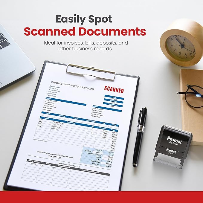 Promot Scanned Self Inking Rubber Stamp - Refillable Scanned Stamper - Business, Bookkeeping, Ordering, Accounting, Work, Office Stamps - Red Ink