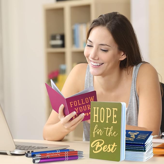 - Motivational Gift Set: the package comes with 32 pieces of inspirational gifts, including 16 pieces of inspirational pens in 8 simple colors and 16 pieces of inspirational mini notebooks in 8 different styles, enough amount can meet your various needs