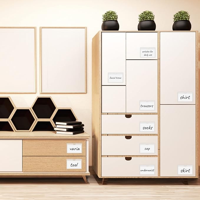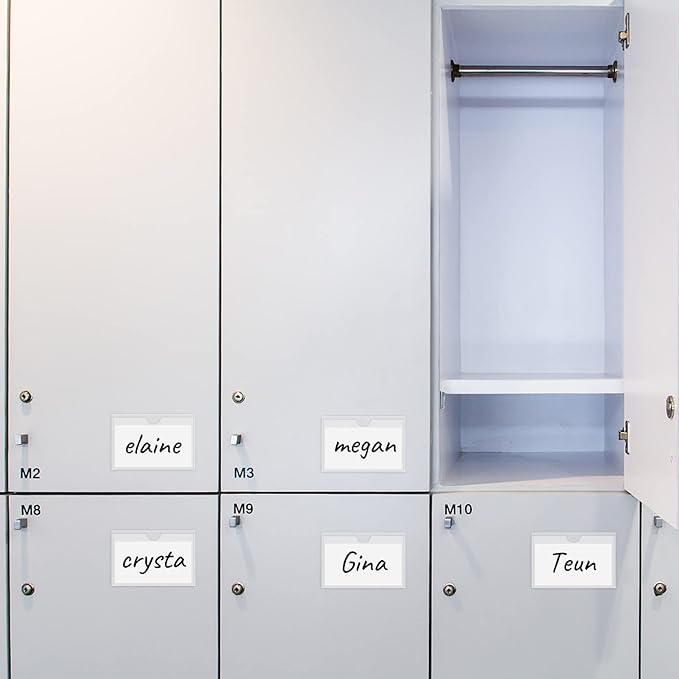 - 【Easy to use】Stick the clear adhesive pockets wherever you need them, then place cards, labels, nameplates, or photos for easy labeling or organization. Adhesive label pockets resist fingerprints, water, dust or dirt.