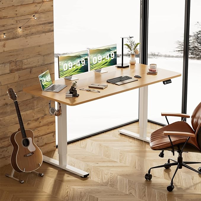 Furmax Electric Height Adjustable Standing Desk Large 63 x 24 Inches Sit Stand Up Desk Home Office Computer Desk Memory Preset with T-Shaped Metal Bracket, Wood