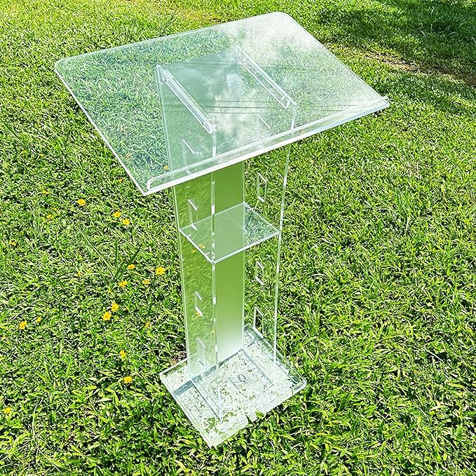 - FEATURES: This is a lightweight, easy portable, slim clear acrylic lectern. There is a storage board in the middle for extra items, which is practical and convenient.