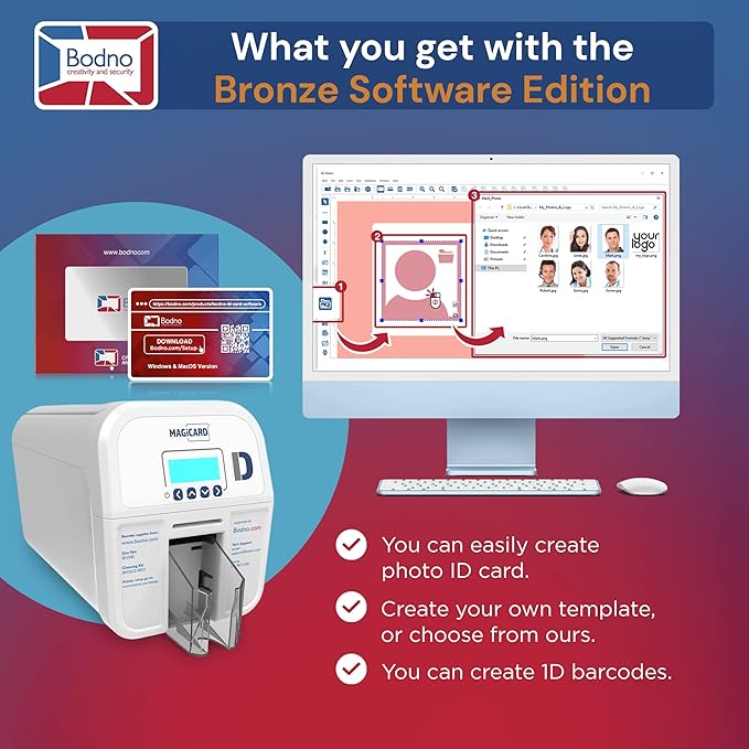 - BODNO BRONZE EDITION SOFTWARE WITH ACTIVATION CODE: The Magicard D comes with Bodno Bronze Edition software, which offers pre-made templates and drag-and-drop design elements for easy ID card creation. Say goodbye to USB sticks! The software is accessible through a secure activation code.