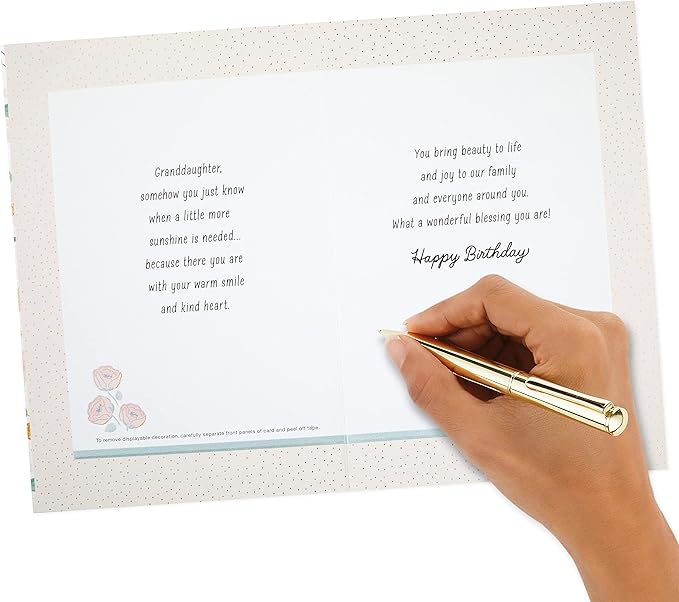 - Inside reads: "Granddaughter, somehow you just know when a little more sunshine is needed . . . because there you are with your warm smile and kind heart. You bring beauty to life and joy to our family and everyone around you. What a wonderful blessing you are! Happy birthday."