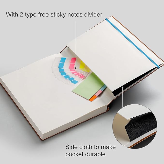 - Humanized Design: Divider sticky notes and 2 bookmarks help you find important content faster. Durable PU leather softcover protects the ruled notebook from wear and tear. Back inner pocket can hold notes, business cards, small gadgets, etc. Closes with an elastic band for maximum privacy