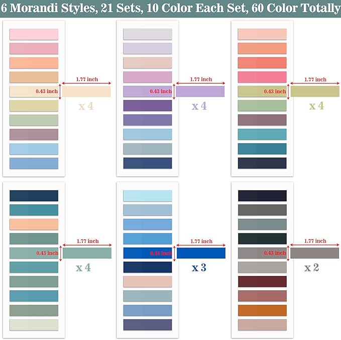 - Plentiful quantity: package include 21 sets of 0.43 x 1.77 inch morandi sticky tabs for annotating books, 4200 pieces in total, abundant quantity and colorful page flag tabs, enough to use for a long times, convenient to mark annotate, and highlight important information