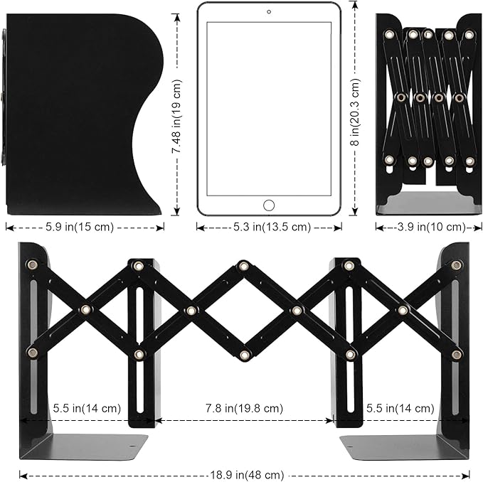 2PCS Adjustable Bookends, Metal Book Ends for Heavy Book, 2 Dividers, Nonslip Book Stander for Desk, Shelf, Office, Stationery Gift, Extends up to 19 inches (Black)