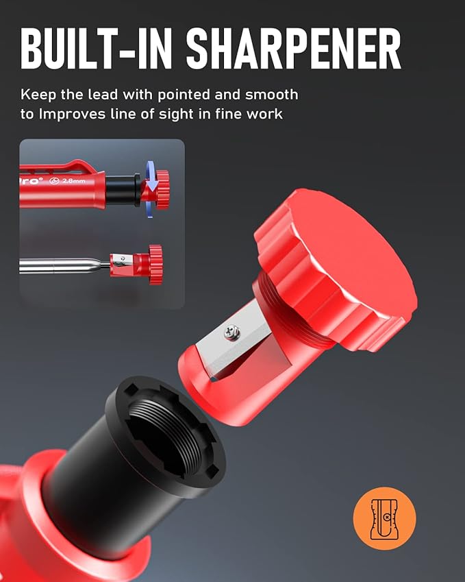 - Carpenter Pencils with Sharpener: The sharpener is screwed into the top of the work pencil, which won't get lost either and your mechanical carpenter pencil will be sharpened for nice precision
